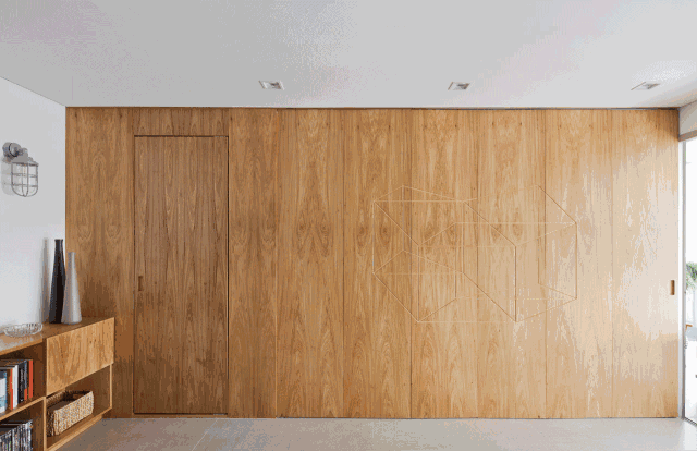 看一下这张动图就懂了,把卧室和客厅给完全分开,不打开门的时候,谁能发现后面还隐藏着一个空间呢~