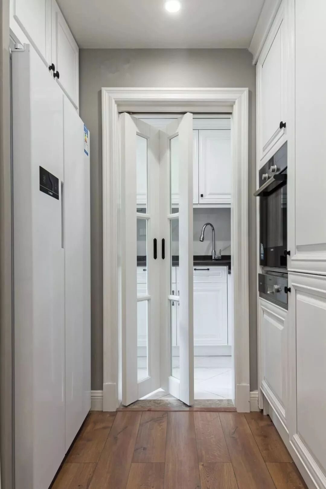 折叠门很适合厨房这样只有一扇门多一些宽度左右的空间,用平开门的话,开关不太方便,会浪费厨房内部的空间。