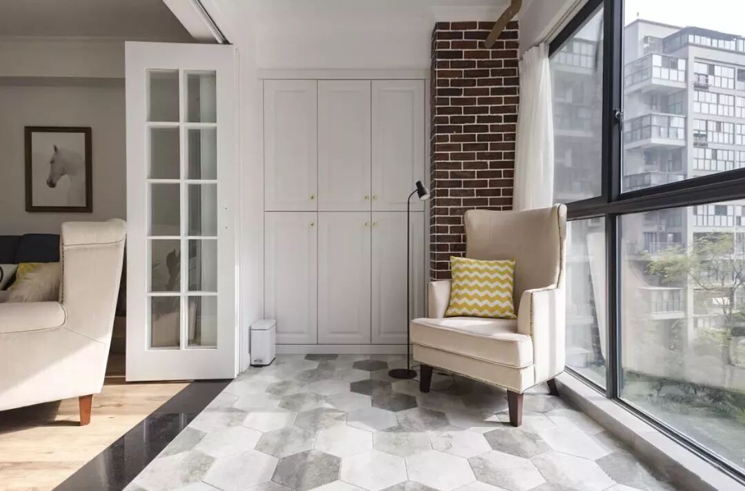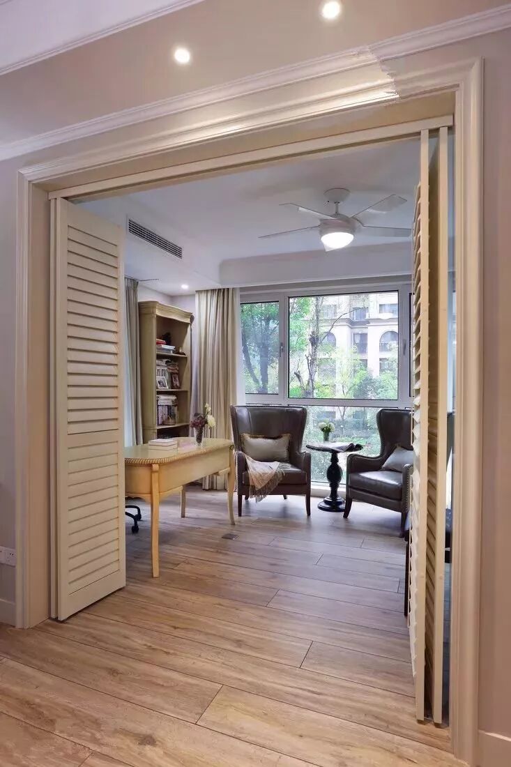 折叠门也很适合用来隐藏其他的空间,比如把书房给藏起来,增加家里的趣味性,一般这样的折叠门会选择不透明、有造型的,作为装饰墙面。
